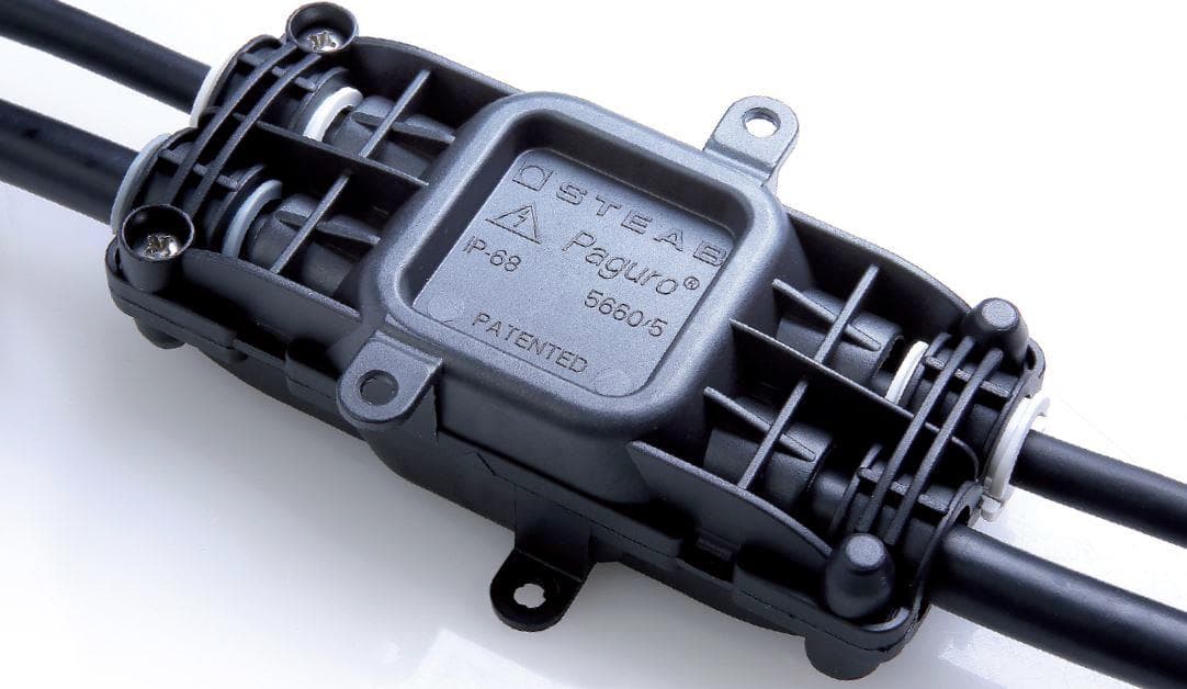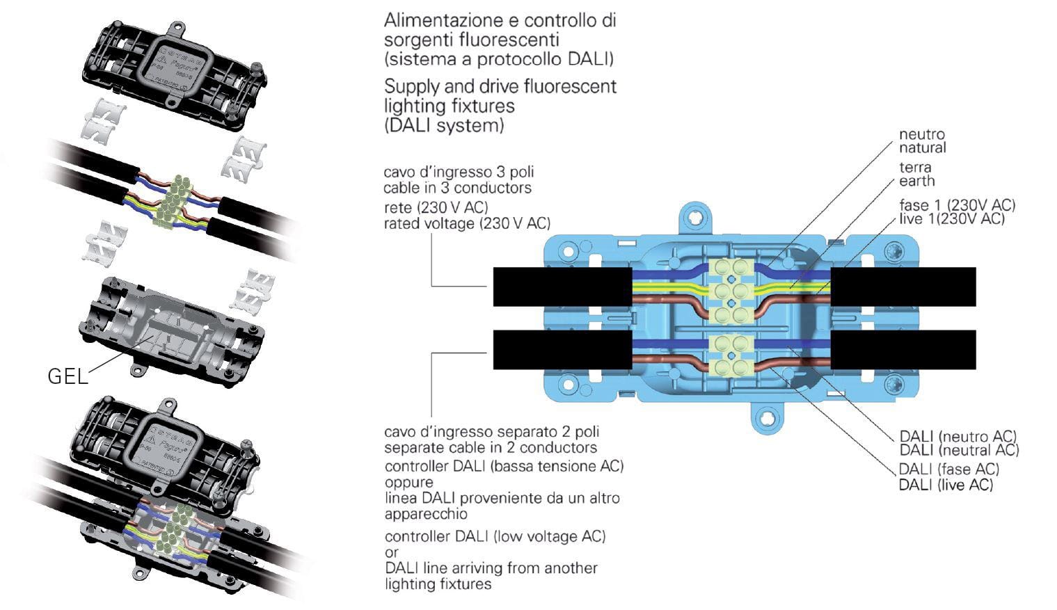 Connettore IP 68 (per connessioni stagne) basato su GEL siliconico bicomponente, predisposto in fabbrica e pertanto pronto all’uso.
