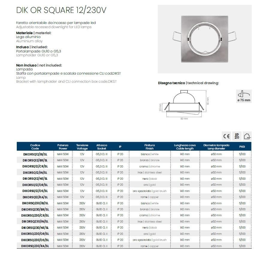 FARETTO ORIENTABILE DA INCASSO QUADRO PER LAMPADA GU10