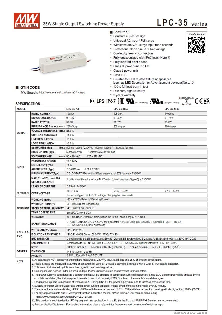 LPC-35-700 MEAN WELL TRASFORMATORE 35W 700MA IP67