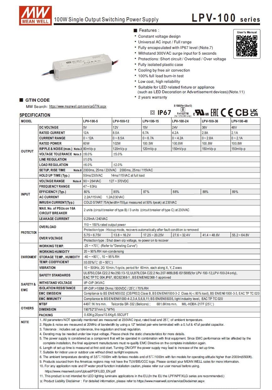 LPV-100-12 MEAN WELL TRASFORMATORE ELETTRONICO 100W 12/VDC IP67