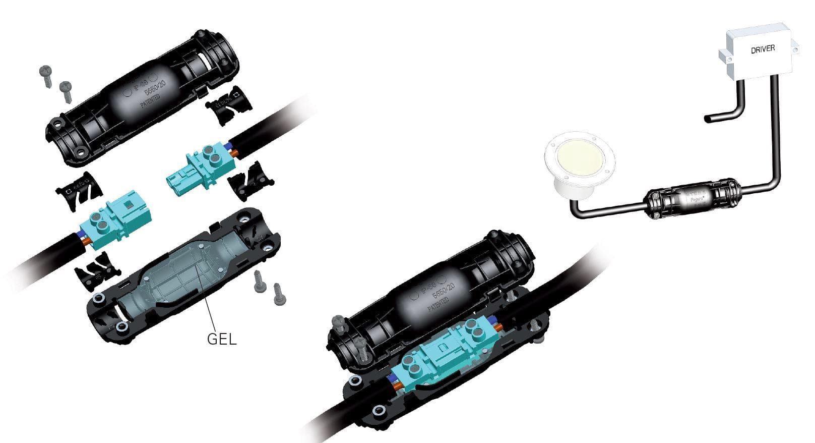 Conector IP68 (para conexiones estancas) basado en GEL de silicona bicomponente, preajustado de fábrica y por tanto listo para su uso.