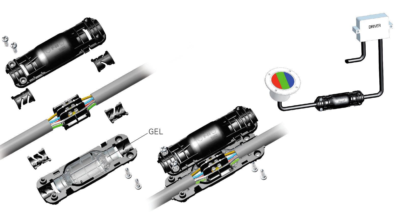 Conector IP68 (para conexões estanques) à base de silicone GEL de dois componentes, pré-configurado na fábrica e, portanto, pronto para uso.