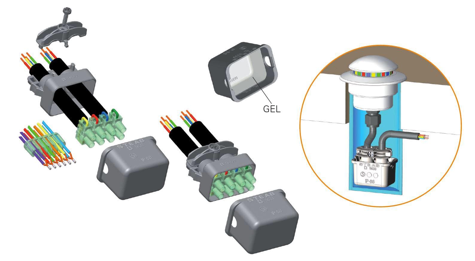 Conector IP68 (para conexões estanques) à base de silicone GEL de dois componentes, pré-configurado na fábrica e, portanto, pronto para uso.