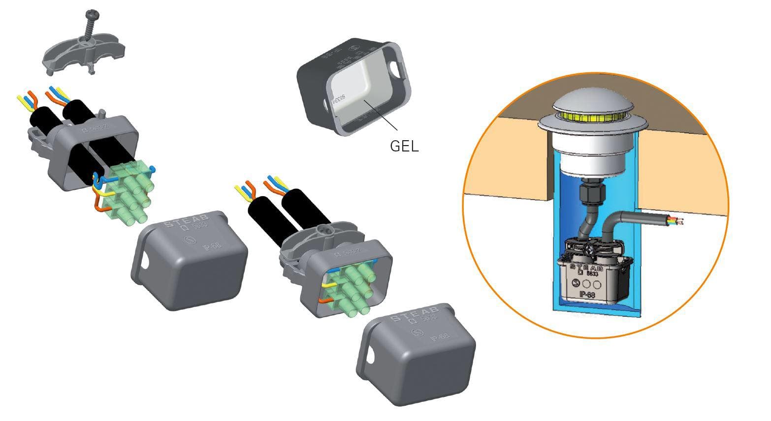 Connettore IP 68 (per connessioni stagne) basato su GEL siliconico bicomponente, predisposto in fabbrica e pertanto pronto all’uso.