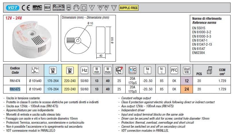 RELCO RN1475 trasformatore elettronico 24vdc tondo 13-40w