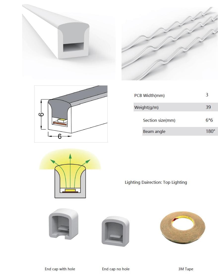 ВИД СВЕРХУ 2 ЯРКИХ СВЕТОДИОДА СИЛИКОНОВЫЙ ПРОФИЛЬ 6X6MM 9,6W 24VDC IP67 DIMM 166,00€
