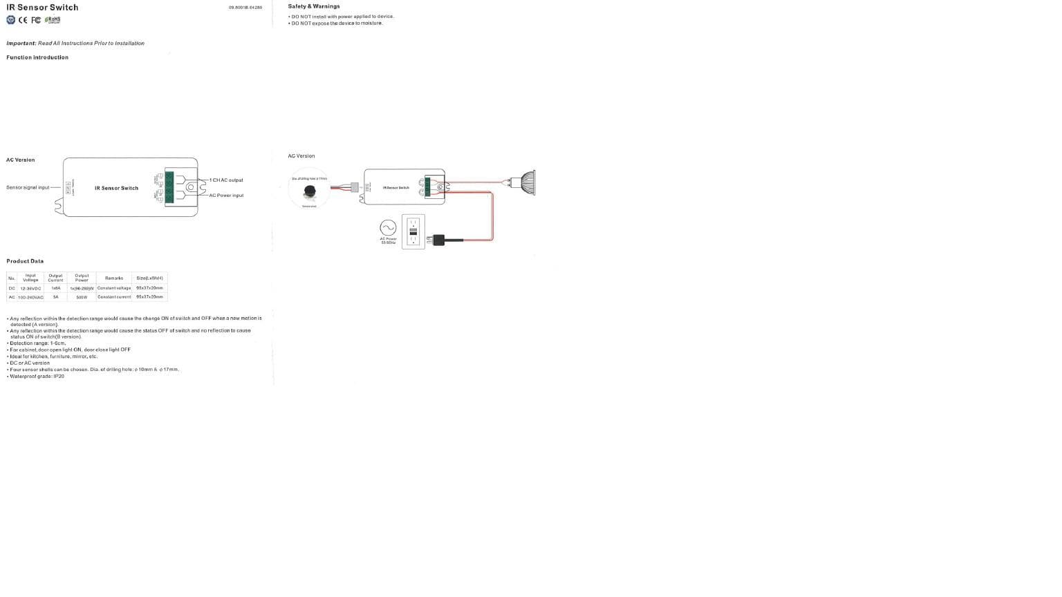 SR-8001B Interruttore a sensore IR 100-240vac per ante mobili MAX 500W